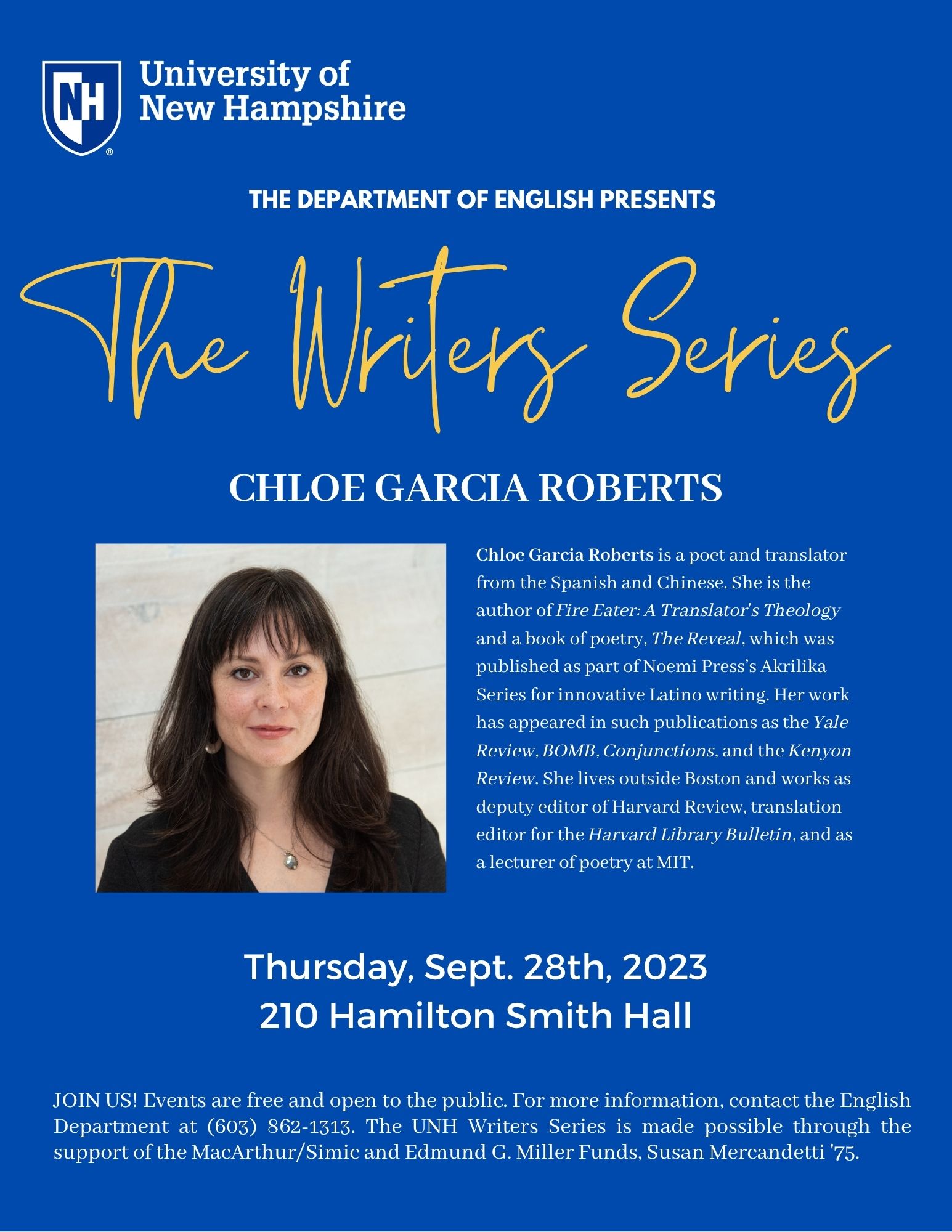 Chloe Garcia Roberts is a poet and translator from the Spanish and Chinese. She is the author of Fire Eater: A Translator's Theology and a book of poetry, The Reveal, which was published as part of Noemi Press’s Akrilika Series for innovative Latino writing. Her work has appeared in such publications as the Yale Review, BOMB, Conjunctions, and the Kenyon Review. She lives outside Boston and works as deputy editor of Harvard Review, translation editor for the Harvard Library Bulletin, and as a lecturer of poetry at MIT.